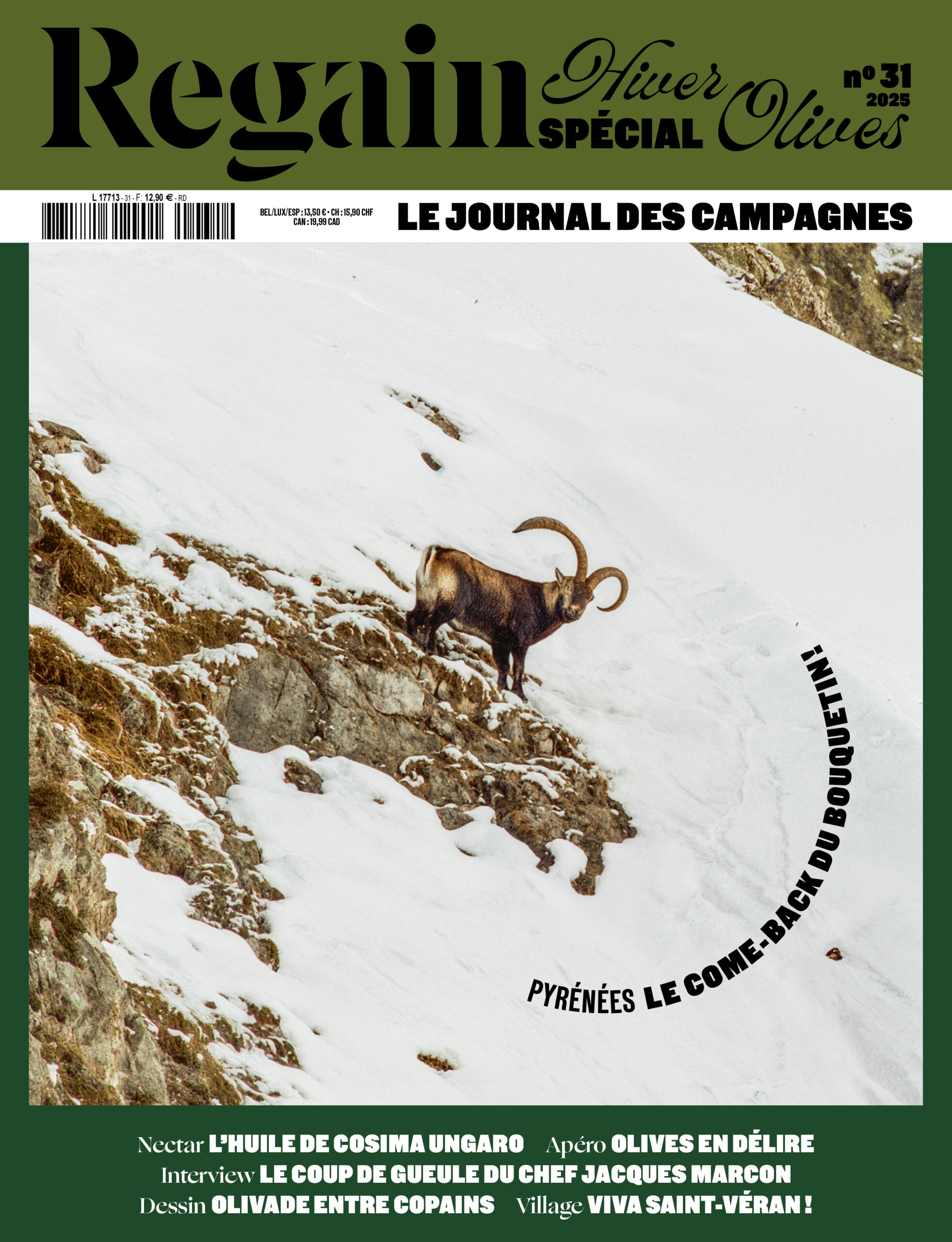 Attention, chaud les olives ! Cap au sud ! Cet hiver, pour traverser la saison sans être ronchon ni enrhumé, Regain vous fait passer entre les mailles du filet… à olives ! Verte, noire, fripée ou charnue, focus sur ce petit fruit qui tient au creux de la main et dont l’or liquide ravit notre palais. On se réchauffe en famille et entre amis chez l’artiste Sophie Estève pour une joyeuse récolte en mots et en dessins, on se plonge dans l’univers baroque de Cosima Ungaro au Domaine de La Cavalerie, on part explorer la dernière manufacture de scourtins de Nyons (kezako?) et on en profite pour visiter une presse avec sa meule à l’ancienne, on découvre le tout premier camion à huile mobile de France, et on n’oublie pas de saucer le fond de nos assiettes puisqu’on retrouve Alix Lacloche avec ses recettes et idées loufoques autour d’olives en délire. Mais aussi le coup de gueule du Chef Jacques Marcon engagé contre la loi Duplomb, le portrait d’un duo d’éleveurs de Haute-Loire droits dans leurs bottes envers et contre tout, la réintroduction réussie du bouquetin dans les Pyrénées, un trio fondu de poignées de portes, une chine cocon qui invite à passer au salon, des news aussi chaudes que de l’huile sur le feu, des bonnes adresses à tire larigot, des conseils au jardin, à la maison, un horoscope et des mots-croisés. Sans oublier nos colifichets, nos conseils de lecture et un objet star de la saison. Un numéro spécial qui met du baume au coeur, et de l’huile dans les rouages d’un monde trop souvent grippé.